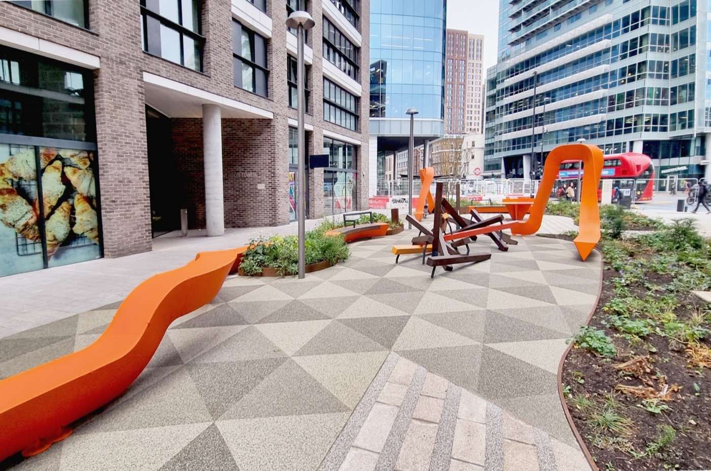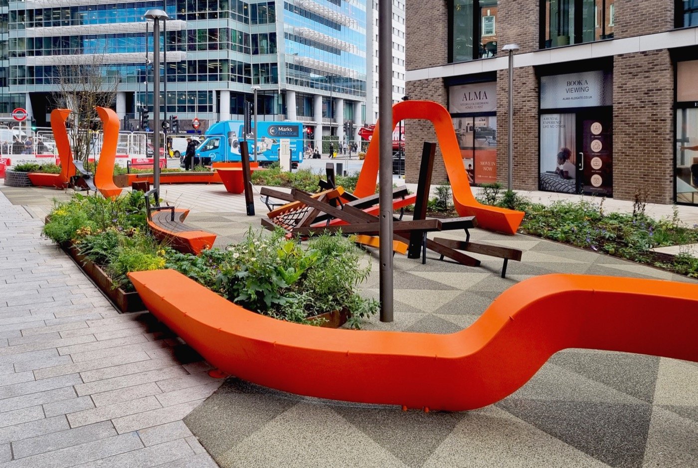 Proje yalnızca fonksiyonel açıdan değil, estetik açıdan da kullanıcı deneyimini zenginleştirir. Dönerek ilerleyen yapılar, yalnızca pratik olmakla kalmaz, aynı zamanda görsel olarak da çekicidir. Bu dinamik alanlar, keşfe davet eder ve etkileşime teşvik eder, bu da Aldgate’in yalnızca bir geçiş alanı değil, aynı zamanda bir buluşma noktası olmasını sağlar.