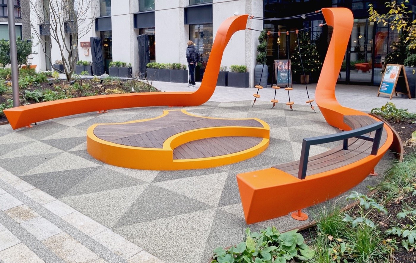 Aldgate projesinin en çarpıcı özelliklerinden biri, “dönerek ilerleyen kurdele” tasarımıdır. Bu tasarım, hareket fikrinden ilham alır; kurdele şeklinde ilerleyen yapı, dinamik şekiller ve alanlar yaratmak için bükülüp kıvrılır. Bu tasarım, görsel açıdan cazip olmasının yanı sıra fonksiyonel faydalar da sağlar. Dönerek ilerleyen yapı, insanların, bisikletlilerin ve araçların şehri daha rahat ve akıcı bir şekilde geçmelerini sağlayarak, alan içinde yönlendirici bir işlev görür.